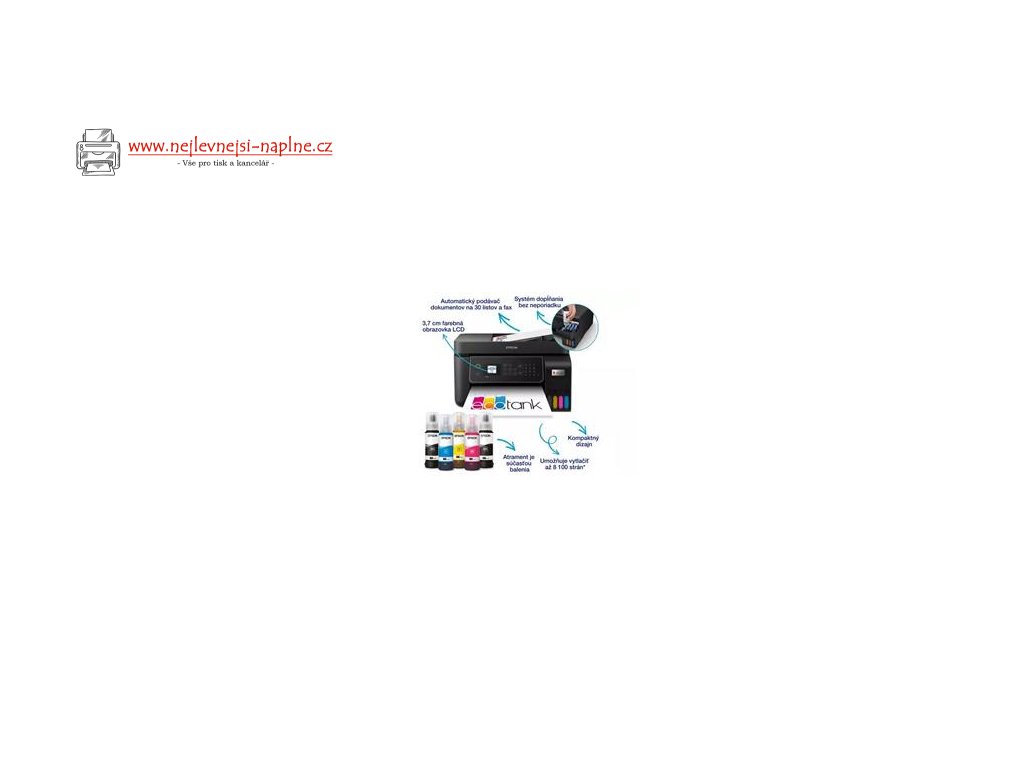odkaz na registraciu predlzenej zaruky: www.epson.sk/zaruka Technika Spôsob tlace - Tlacová hlava Epson Micro Piezo™ Konfigurácia trysiek - 180 Trysky cierna, 59 Trysky na farbu Minimálna velkost kvapôcky - 3 pl, S technológiou premenlivej velkosti kvapôcok atramentu Atramentová technológia - Atrament na báze farbiva Rozlíšenie tlace - 5.760 x 1.440 DPI Kategória - Post individual, Grup de lucru Multifunkcné - Tlac, Skener, kópia, Fax LCD displej - Typ: Farebné, Uhlopriecka: 3,7 cm Emulácia - ESC/P-R Tlac Number of colours - 4-farebný Rýchlost tlace podla ISO/IEC 24734 - 10 Str./min. Ciernobiela, 5 Str./min. Colour, 69 Sekundy na fotografiu 10 x 15 cm Rýchlost tlace - 33 Str./min. Ciernobiela (obycajný papier), 15 Str./min. Colour (obycajný papier), 27 Sekundy na fotografiu 10 x 15 cm (prvotriedny lesklý fotografický papier Epson) Farby - Cierna [Dye], Azúrová [Dye], Žltá [Dye], Purpurová [Dye] Skenovanie Rýchlost jednostranného skenovania (ciernobielo A4) - 200 dpi (with ADF); , 4,5 z obr./min. pri skenovaní z ADF 200 dpi (flatbed) 12 sec. with flatbed scan Rýchlost jednostranného skenovania (farebne A4) - 200 dpi (with ADF); , 4,5 z obr./min. pri skenovaní z ADF 200 dpi (flatbed) 29 sec. with flatbed scan Rozlíšenie skenovania - 1.200 DPI x 2.400 DPI (horizontálne x vertikálne) Optické rozlíšenie (automatický podávac dokumentov) - 1.200 DPI x 2.400 DPI (horizontálne x vertikálne) Výstupné formáty - BMP, JPEG, PICT, TIFF, Skenovanie do multi-TIFF, PDF, PNG Typ skenera - Kontaktný snímac obrazu (CIS) Fax Typ faxu - Jednoduché ciernobiele a farebné faxovanie Rýchlost odosielania faxu - až 33,6 kbps / pribl. 3 s/stranu Režim korekcie chýb - Fax CCITU/ITU Group3 s režimom korekcie chýb Pocet rýchlych volieb pre fax (max.) - 100 názvy a císla Pamät (strany) - až 100 strán (ITU-T tabulka c. 1) Funkcie faxu - Fax cez PC, Automatické opakovanie, Adresár, Oneskorené odoslanie, Odoslat fax, Polling Reception Manipulácia s papierom/médiom Pocet priehradiek na papier - 1 Formáty papiera - 10 x 15 cm, Letter, No. 10 (obálka), DL (obálka), C6 (Obálka), B5, A6 (10,5x14,8 cm), A5 (14,8x21,0 cm), A4 (21.0x29,7 cm), Legal, 16:9, Užívatelsky definované, 13 x 18 cm Obojstranná tlac - Manuálne Automatické podávanie dokumentov - 30 Strany Kapacita zásobníka na papier - 30 Listy Paper Tray Capacity - 100 Listy Štandardná Vhodná hmotnost papiera - 64 g/m˛ - 300 g/m˛ Spracovanie médií - Tlac bez okrajov (až 10 x 15 cm) Prípojky - Siet WiFi, Port USB, Siet Ethernet, Wi-Fi Direct Tlac z mobilných zariadení a cloudu - Epson Connect (iPrint, Email Print, Remote Print Driver), Apple AirPrint Kompatibilné operacné systémy - Mac OS X 10.6.8 or later, Windows 10, Windows 7, Windows 8, Windows 8.1, Windows Server 2008 (32-bitový/64-bitový), Windows Server 2008 R2, Windows Server 2012 (64bit), Windows Server 2012 R2, Windows Server 2016, Windows Vista, Windows XP Professional x64 Edition SP2 or later, Windows XP SP3 or later (32-bit), Windows Server 2003 R2, Windows Server 2003 SP2 or later Všeobecne Spotreba energie - 12 Watt (samostatné kopírovanie, podla normy ISO/IEC 24712), 0,7 Watt (úsporný režim), 4,5 Watt Pripravený, 0,2 Watt (vypnutie), TEC 0,13 kWh/week Napájacie napätie - AC 100 V - 240 V, 50 Hz - 60 Hz Rozmery produktu - 375 x 347 x 237 mm (Šírka x Hlbka x Výška) Hmotnost produktu - 5 kg Záruka - 12 mesiace Oprava po prinesení zariadenia do servisu, 30.000 Strany C13T00S14A - black - 8100str. C13T00S24A - cyan - 6500str. C13T00S34A - magenta - 6500str. C13T00S44A - yellow - 6500str. C13T00S64A - CMYKDoplňkové parametry