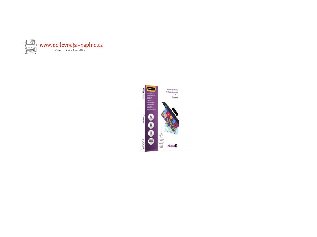 Enhance80. Zkrášlí a zvýrazní barevnost a celkový vzhled vašich dokumentů. Poskytnou jim ochranu proti nečistotám, vlhkosti a prodlouží jejich životnost.Prvotřídní laminovací fólie lesklé Fellowes ImageLast s šipkou směru laminace a logem, které po průjezdu nahřátým laminátorem vymizí. Vymizení znaků vás ujistí o optimální kvalitě laminace. Správná teplota laminátoru aktivuje lepivou složku fólie.Fólie je vyrobena s přesahem cca 3 mm na všech stranách oproti standadním formátům papíru. Vhodné pro laminaci za tepla pro všechny druhy stolních laminátorů.Doporučení nastavení teploty pro optimální laminaci: 80mic (90-110°C)Doplňkové parametry