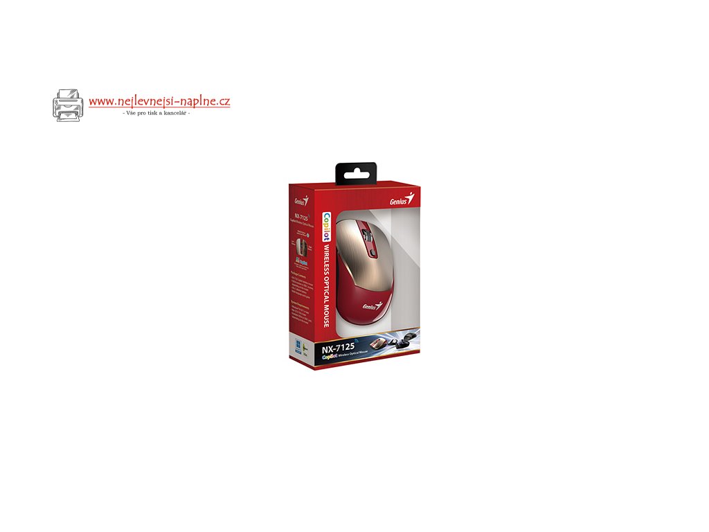 Genius NX-7125Bezdrátová myš disponující optickým senzorem s rozlišením 1200 DPI. Připojení k počítači je realizováno bezdrátově skrze miniaturní USB-A přijímač a rozhraní 2,4 GHz. Myš je vybavena samostatným tlačítkem pro vyvolání AI asistenta Microsoft Copilot (pouze ve Windows 11). Napájení zajišťuje jedna AA baterie.